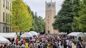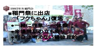 早稲田大学には3つの大きな祭りがあります。9月の「地球感謝祭」は早稲田地域の商店街のお祭りを校内で行います。10月の「稲門祭」は卒業生が校内に出店や様々な企画運営するお祭りです。11月はみなさんご存じの学生が運営する「早稲田祭」です。稲門祭では西門の名店「ふくちゃん」の復活としてオーナーシェフの方も参加していただき出店しました。チョコとん(チョコレートとんかつ)とチーメン(チーズメンチカツ)を毎年提供しています、稲門祭への出店は同じ作業をすることで一体感が生まれます。親睦が深まる気がします。