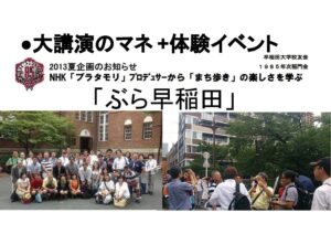 体験イベントは参加者全員が体験できる小規模の防災訓練等が好評でした。スポーツ観戦等も盛り上がりますが、自身が体験する企画は喜びがあるようです。徐々に参加者も増えNHKのブラタモリをつくられた早稲田1年後輩のプロデューサーに番組と同じ早稲田界隈を案内してもらう「ブラ早稲田」は60人もの参加者があり細道で近隣に迷惑をかけないか心配でした。多様性を持ちながらも規律ある早稲田の卒業生は何事もなく楽しめました。一つの山に神社とお寺とキリスト教会がある早稲田はかなり珍しいそうです。その教会のリバティホールから出発し番組をなぞりました。また、85年次にはグライダーのアンデス縦断の世界記録を持つ方がいて講演会とグライダーの試乗を行っていただきました。私事ですが原動機のない乗り物が好きでスキーやヨット、少し自転車をしていました。エンジン音のない空を飛ぶのは三次元で格別の体験です。同じ体験をすることで親近感が高まりました。