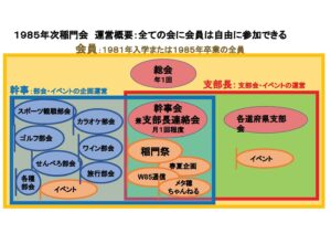 2010年に1985年次稲門会は発足しました。慶應義塾は昔から年次の会があり、1985年次にあたるのは126三田会です。彼らと運営など教えを乞う為に飲み会をしました。三田会は卒業と同時に発足し会長・役員が決まり変わらないようであります。そして、三田会は塾内融和の会であるので稲門会との協業については慶應義塾の名称を使ってほしいとのことでした。少し驚きましたが、そういう世界もあるのねと見分を広げた気持ちになりました。稲門会は対外コラボでも稲門会です。また、三田会のある人と飲んだ時「50にもなって役員になっていない人間は会長を辞めた方がいい」と言われたと泣いておりました。卒業してからずっと三田会のために尽くしてきたのにとのこと。「早稲田はいいよな辻村さんみたいにヒラでも会長になれるもんな」というので、「馬鹿にしているのか」と大笑いして「部外者の私でもあなたの業績は素晴らしいと思うので大半の方は分かっている」と元気づけた記憶があります。素晴らしい運営をされている三田会も参考にしながら1985年次稲門会の活動方針を話し合い決めました。そして早稲田愛のある人は誰でも幹事になれ、幹事会には幹事でなくても参加できることとしました。活動方針は1.会員の親睦、2.母校への貢献、3.社会交流(社会貢献)です。年次稲門会の発足からの活性化の努力をお伝えしたい。もちろん稲門会でよくあるカラオケ部会・ゴルフ部会等もありますが、独自性のある親睦については1.愛称をつける。2.独自商品を作る。3.体験イベントを行う。4.稲門祭に出店する。ことを行ってきました。